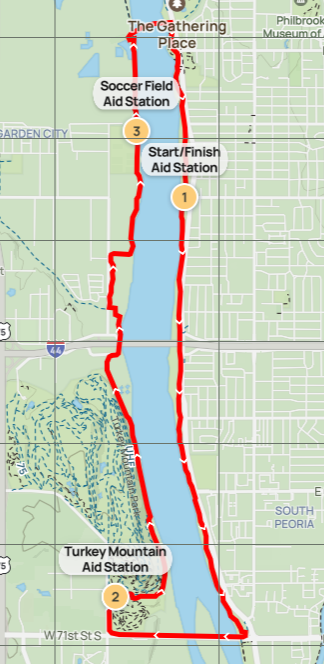 There will be aid stations and crew access points at Turkey Mountain lower parking lot (6850 S Elwood Ave), the West Bank Soccer Complex (W 36th Pl & Elwood Ave) and the start/finish line. Aid stations will be fully stocked with water, Gatorade, sweet & salty snacks. Probably sandwiches. Maybe watermelon. Definitely fantastic volunteers and positive vibes.